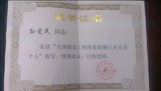 近日,從中國建筑業(yè)協(xié)會工程建設(shè)質(zhì)量監(jiān)督與檢測分會傳來喜訊,我公司孫愛民副總經(jīng)理榮獲全國建設(shè)工程檢測行業(yè)先進(jìn)個人。